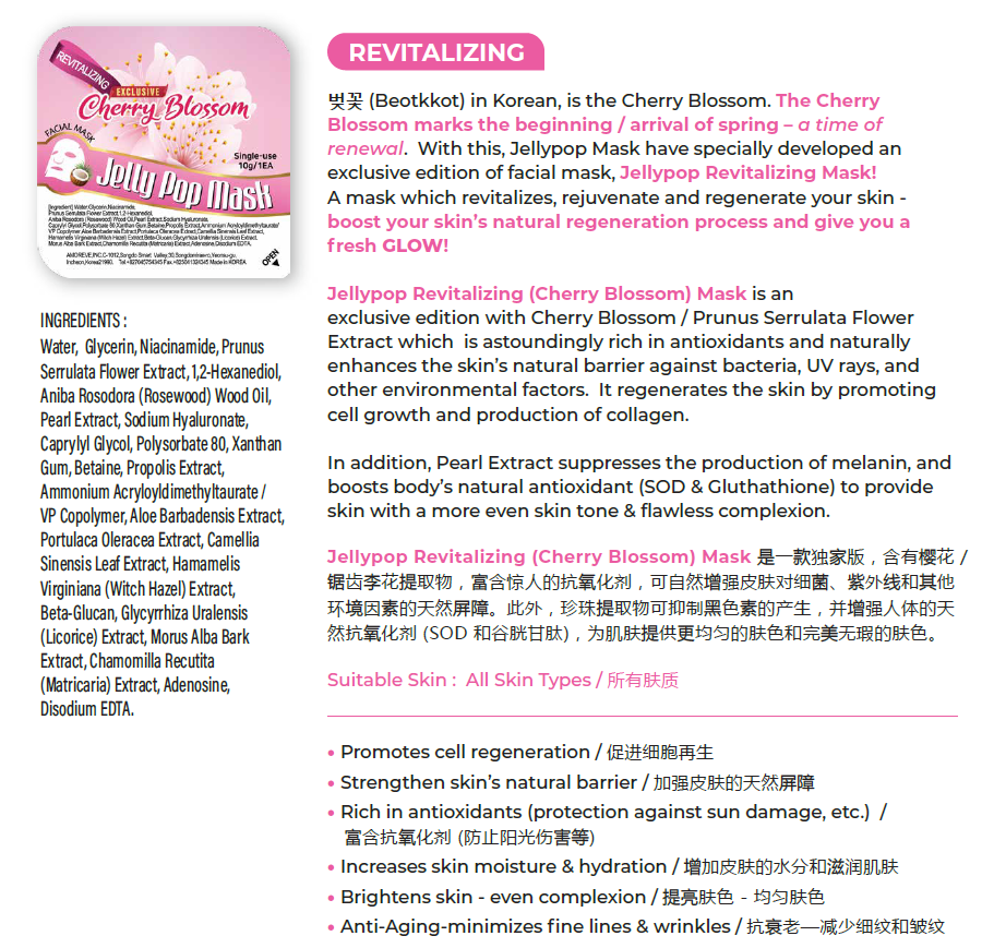 Jellypop Bio-Cellulose Capsular Mask is a bio-cellulose mask which is made from natural coconut fiber with 3D retiform structure which allows the mask to absorb 200 times more essence than in its dried form.